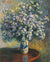 Claude Monet, a highly successful French artist from the late 1800s, was a significant figure in the Impressionist movement. Over his artistic lifetime, he created multiple renditions of the classic subject of flowers in a vase. One of his earlier pieces, 'Asters', showcases chaotic purple blossoms tumbling from a decorative vase.