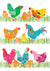 An illustration that combines different mediums showing chickens keeping a careful eye on their eggs.