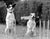 This snapshot of a pair of dogs dates back to 1984 and was captured by their owner, Don Crown, a notable street performer. He was frequently seen playing music and looking after his pet budgies outside the Tate Modern in London, especially during the summer seasons of the '70s and '80s. In this specific picture, Crown arranged his dogs to appear as if they were playing cricket at Dagenham park. The dog on the left was made to pose as a wicket-keeper, while the dog on the right was the batsman.